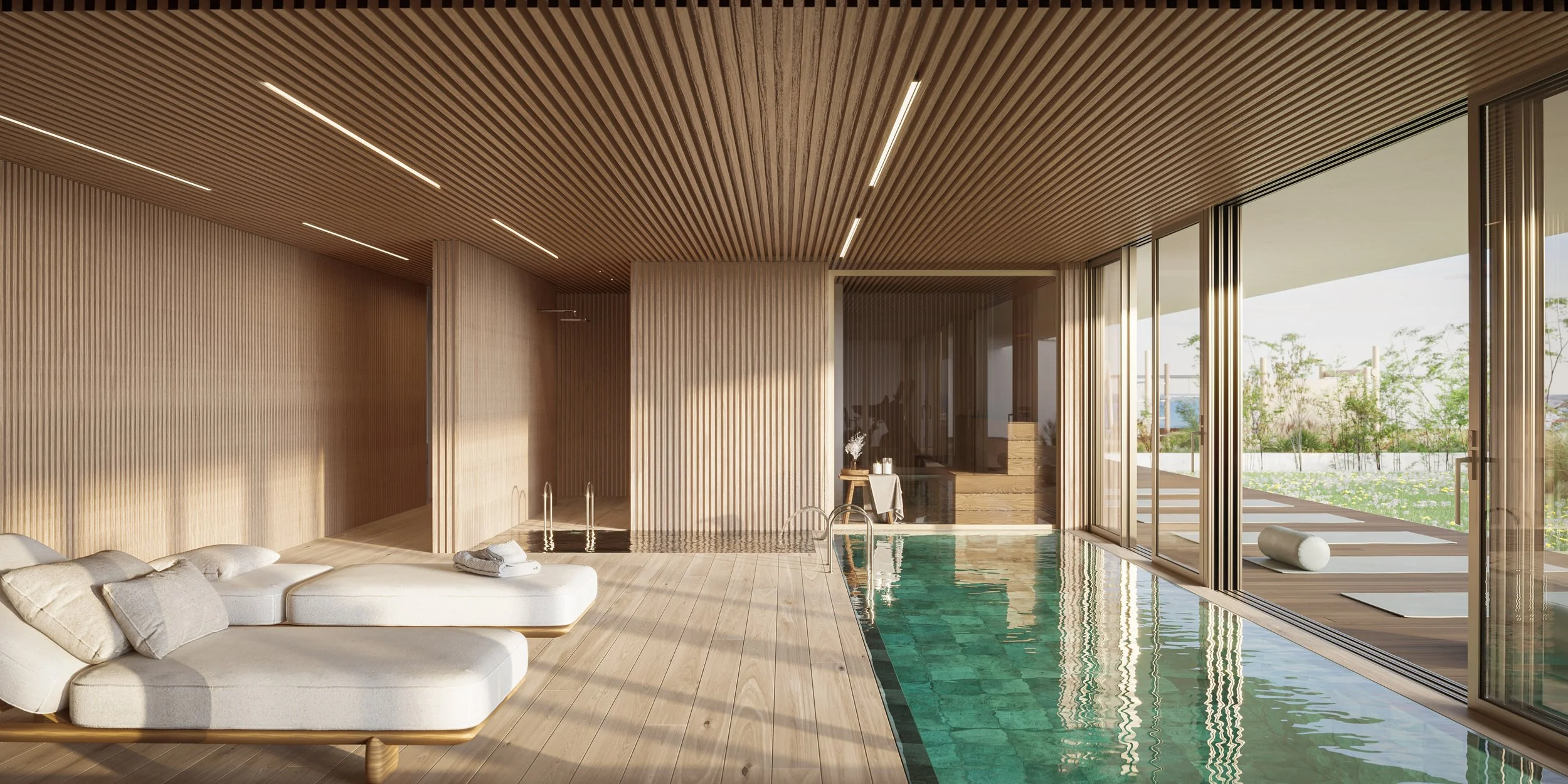 Indoor and outdoor pools, a gym, sauna, and landscaped gardens offer space to restore, move, and unwind — all just steps from home.